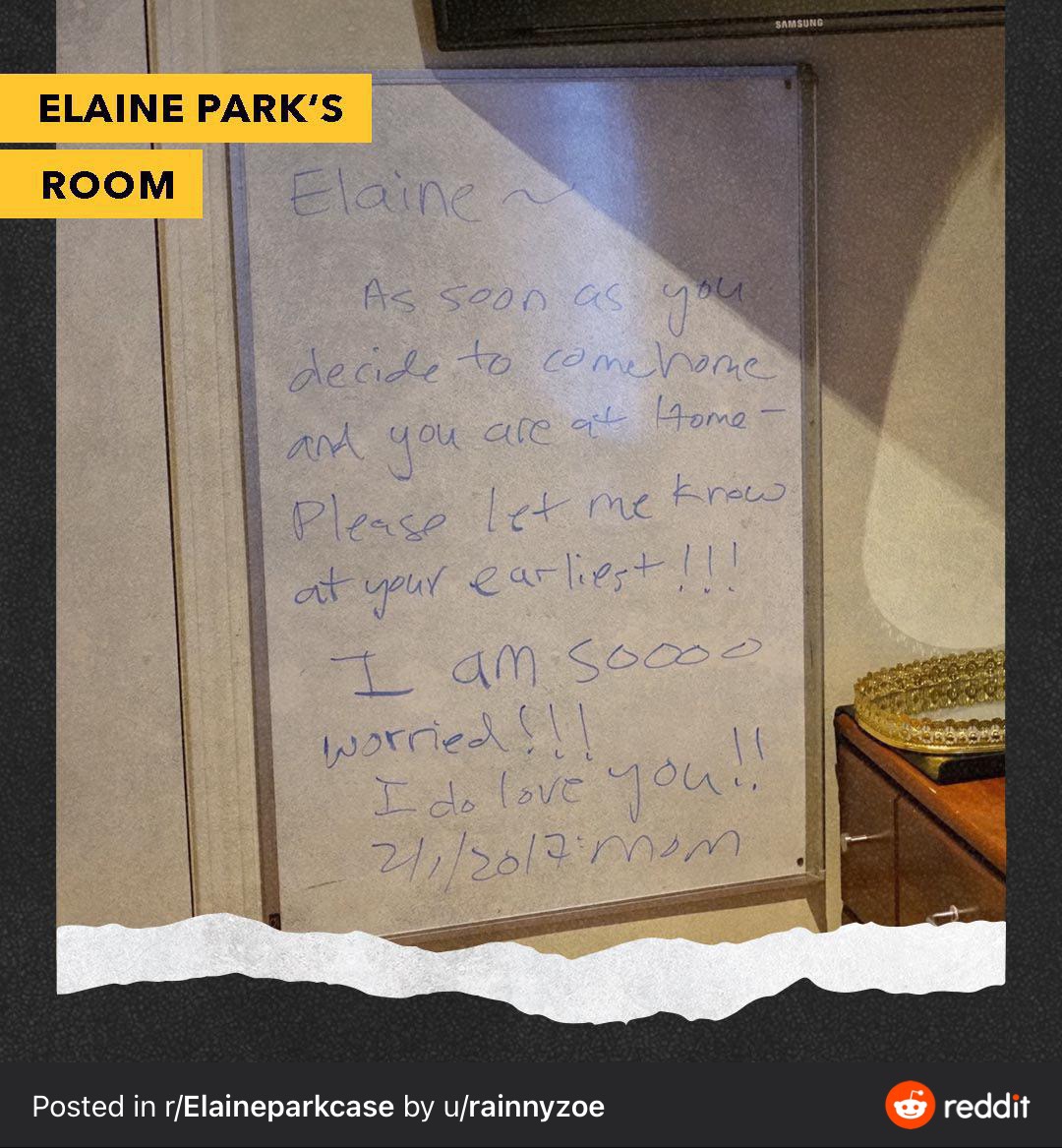 Here’s the timeline given by Susan Park about her last interactions with Elaine. Below that I’ve expanded it to add Susan’s descriptions